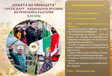 „ЦЕНАТА НА СВОБОДАТА“ ТРЕТИ МАРТ НАЦИОНАЛЕН ПРАЗНИК НА РЕПУБЛИКА БЪЛГАРИЯ Програма 10:00 ч. – Отваряне на комплекса Посрещане на гостите с възрожденска музика и тематична атмосфера. Свободно посещение на обектите в Исторически парк. 11:30 ч. – Сбор на участниците Историческо построение на дружина от Освобождението и заемане на местата от официалните гости. 12.00 ч. Възпоменателно факелно шествие „По стъпките […]